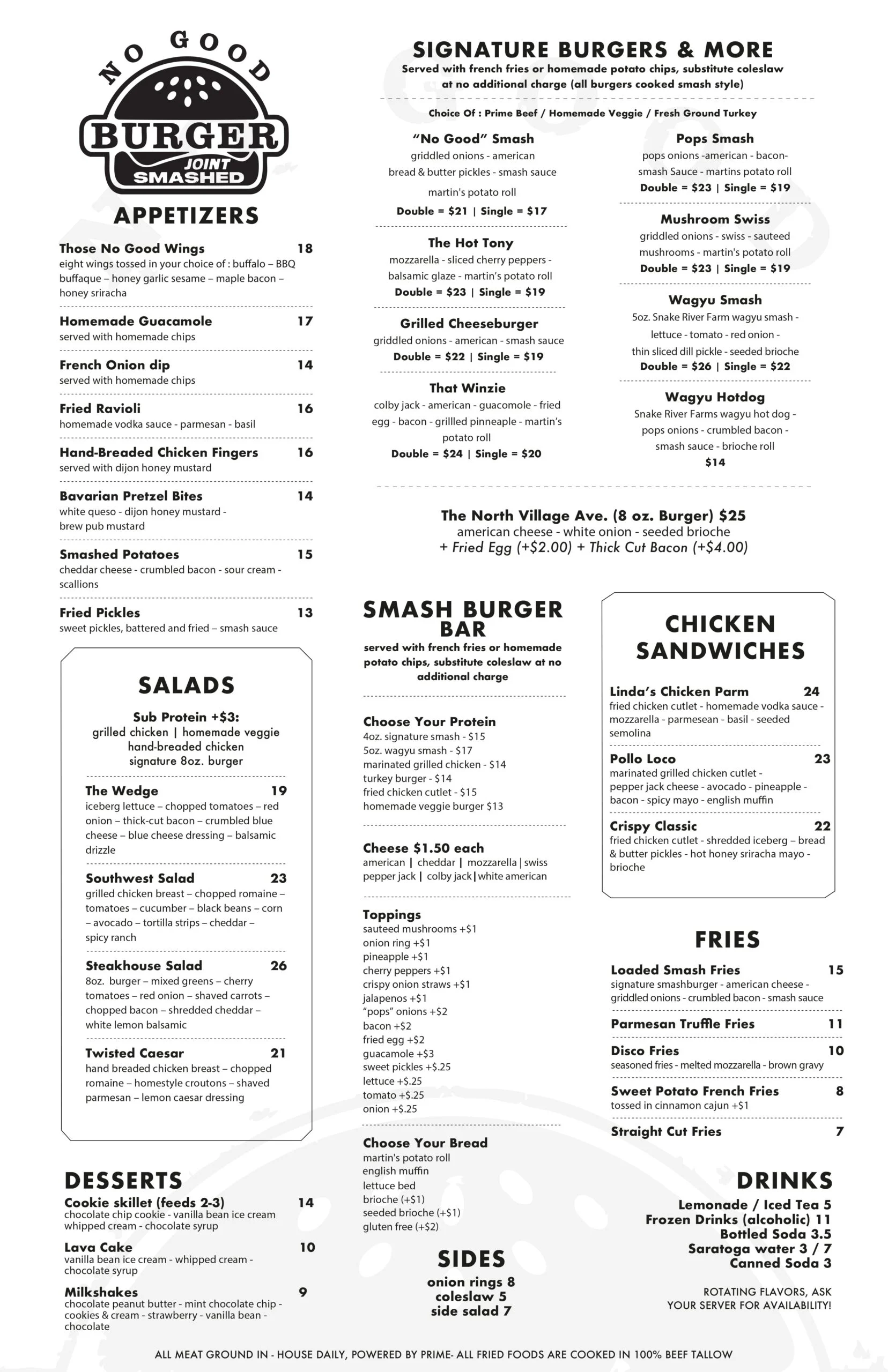 Craving No Good Burger Joint Smashed? Place your order online for quick pickup or delivery and get the bold flavors, juicy burgers, crispy fries, and comfort food favorites you love—hot, fresh, and ready when you are.